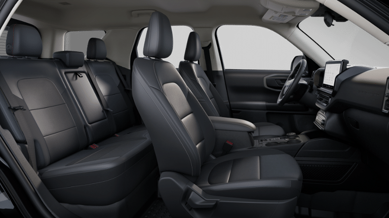 - Includes cargo mat, front and rear floor liners (without carpet mats), textured matte black hood graphic, Carbon Black grille with black painted Bronco lettering, painted shadow black roof, premium-trimmed sport contour bucket seats, front driver/passenger seat back map pockets, unique badges with black accents, 17 inch matte black-painted aluminum wheels, 225/65R17 102H all-season tires, and modified smoked chrome Ford oval on liftgate with black painted Bronco Sport lettering.