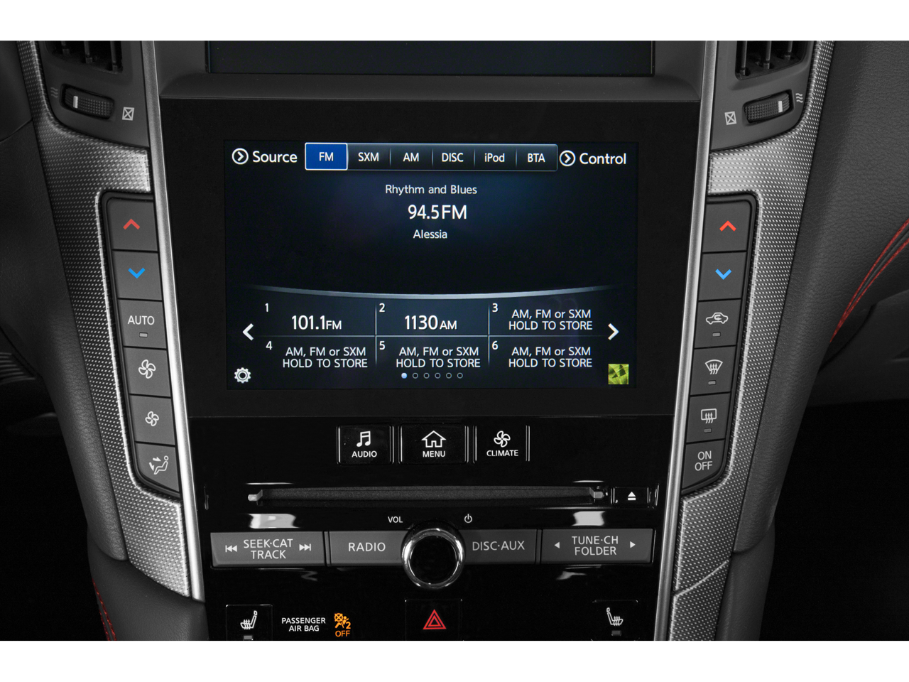 - Radio: INFINITI InTouch Navigation -inc: INFINITI InTouch services, AM/FM/HD/CD w/MP3 playback capability, 6-speaker audio system, Radio Data System (RDS), speed sensitive volume control, 2 USB connection ports for iPod interface, flash drive or other compatible devices, SiriusXM radio w/3-month trial subscription, SiriusXM Travel Link w/4-year complimentary trial subscription, SiriusXM Traffic including real-time traffic information and steering wheel-mounted audio controls and Bluetooth® streaming audio