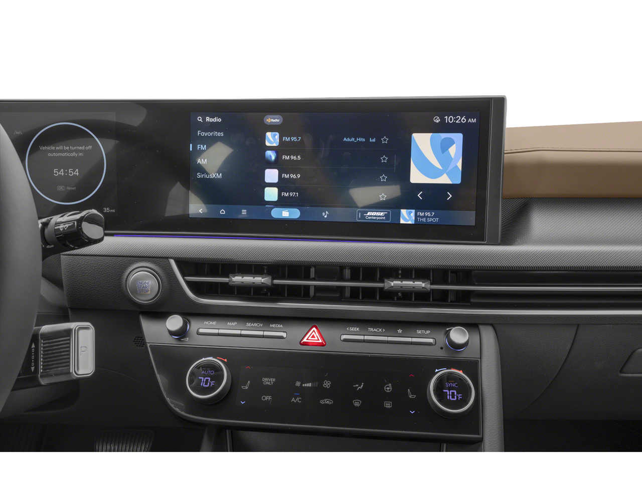 - Radio: AM/FM/HD/SiriusXM -inc: 12.3" high-resolution touchscreen, Bose premium audio w/12 speakers (1 center channel, 2 dash, 2 front tweeters, 4 door mounted, 2 rear mounted speakers plus 1 rear mounted subwoofer), dynamic voice recognition, smartphone integration, Bluetooth®, Over-The-Air updates, USB connectivity, Blue Link connected car, Android Auto/Apple CarPlay capability (wireless and wired), HERE HD traffic and diversity antenna (navigation and premium audio)